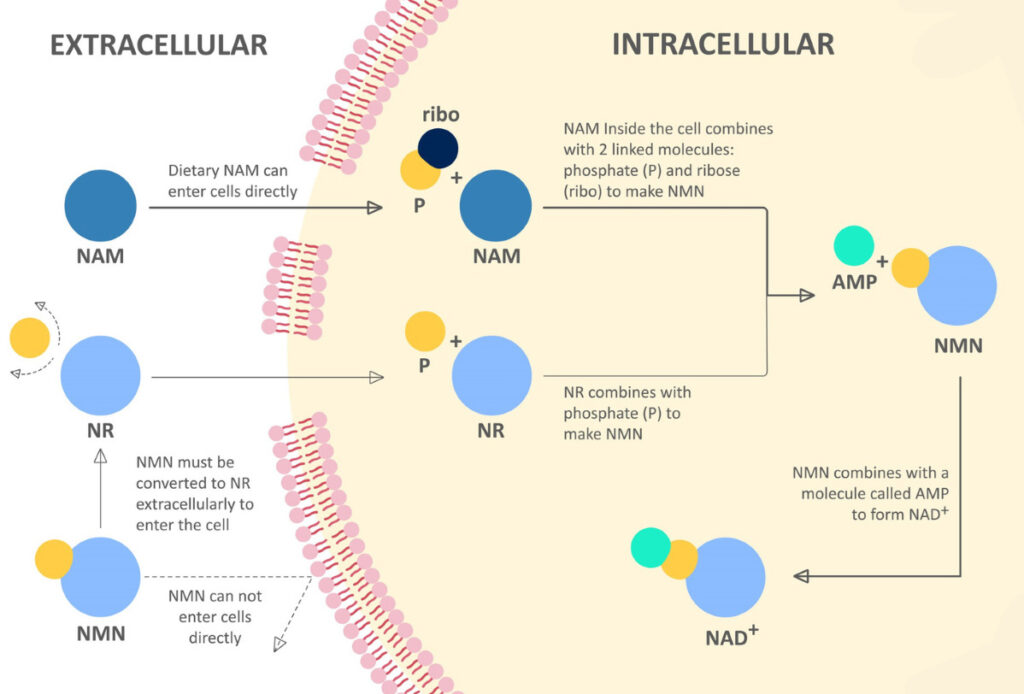 NAM can enter our cells directly and, together with ribose and phosphorus, be further converted to NMN and then NAD+.