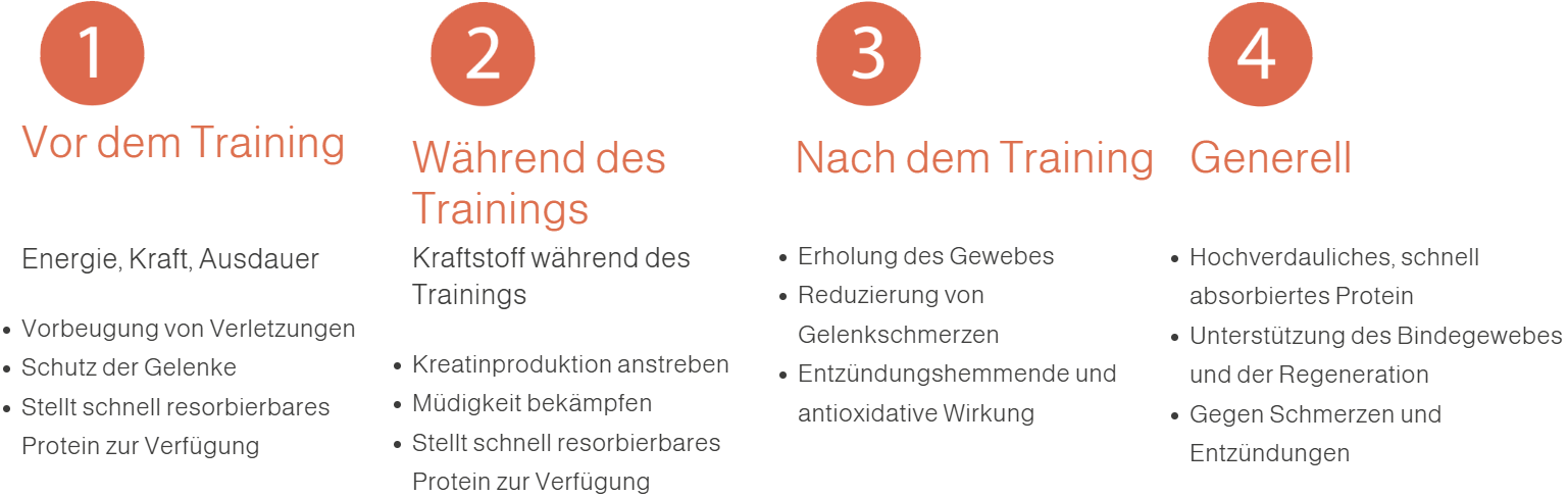 Before Training: Energy, strength, endurance, prevention of injuries, protection of the joints, provides fast-absorbing protein. During Training: Fuel during exercise, supports creatine production, helps fight fatigue, provides fast-absorbing protein. After Training: Supports tissue recovery, reduces joint pain, has anti-inflammatory and antioxidant effects. In General: Highly digestible, fast-absorbing protein that supports connective tissue and recovery, helps relieve pain and inflammation.