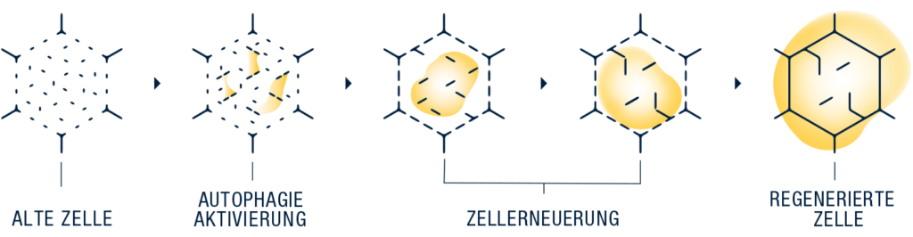 Autophagy is a kind of recycling plant of human cells. During this self-cleaning process, faulty or no longer required cell components are broken down, utilised and converted back into cell energy. Because autophagy loses efficiency with age, disease-related changes occur. Deposits in the cells, which in turn may lead to dementia, diabetes, tumors and atherosclerosis. The increased uptake of spermidine signals the cells to start these self-cleaning processes and thus protects against deposits and premature ageing.